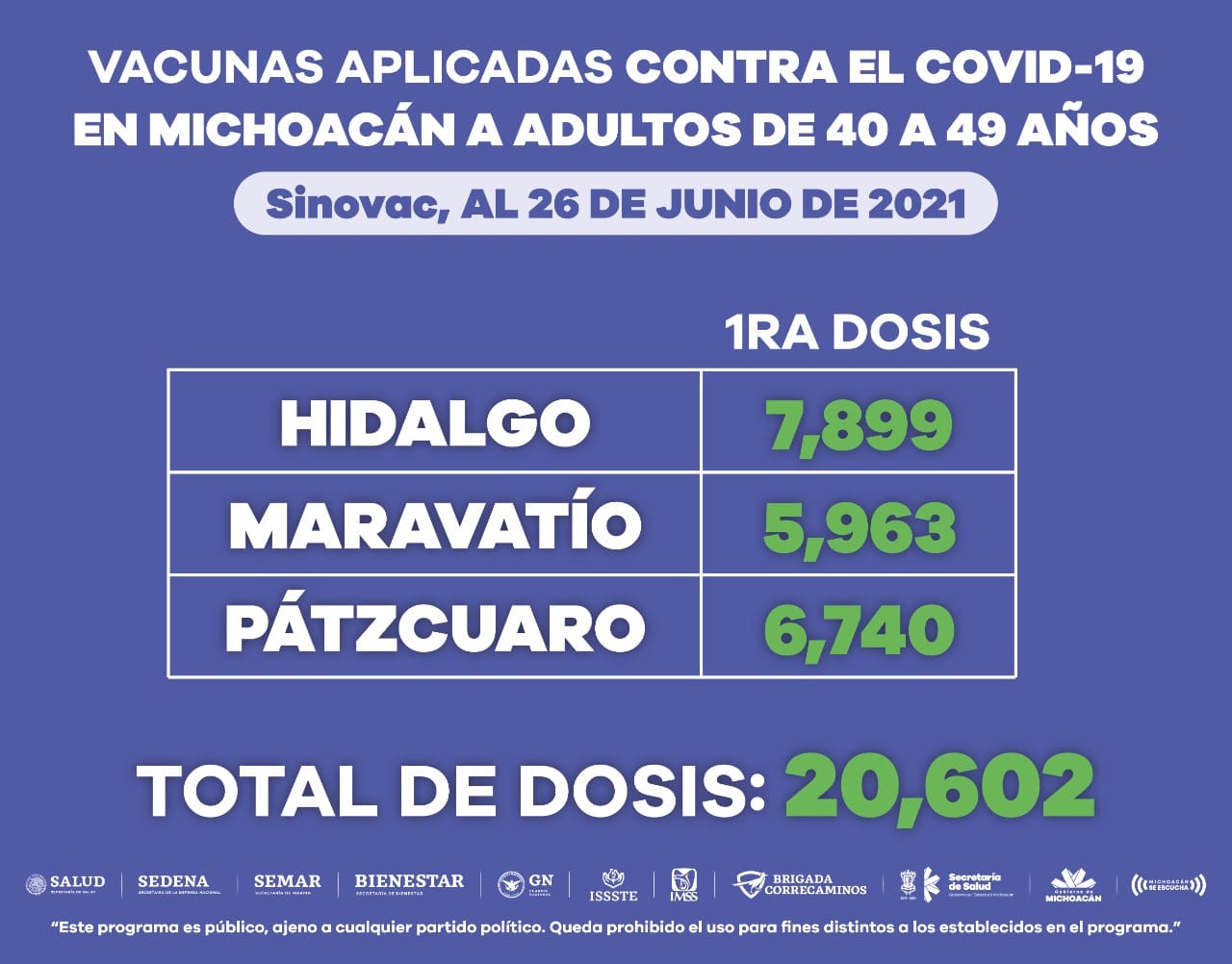 Morelia, Michoacán, a 26 de junio de 2021.- Con la aplicación de 199 mil 142 vacunas anti COVID-19, para personas de 40 a 49 años de edad, se avanza con éxito en la jornada de inmunización de este grupo etario.