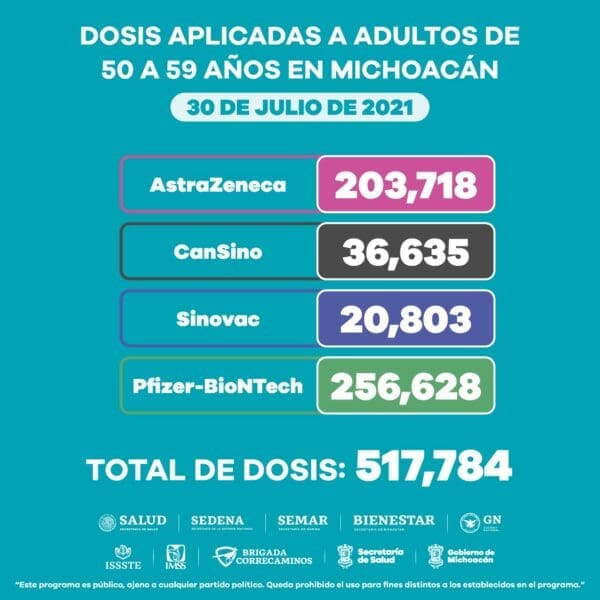 En lo que respecta al grupo de 50 a 59 años se han aplicado 203 mil 718 dosis de AstraZeneca, 36 mil 635 de CanSino, 20 mil 803 de Sinovac y 256 mil 628 de Pfizer.