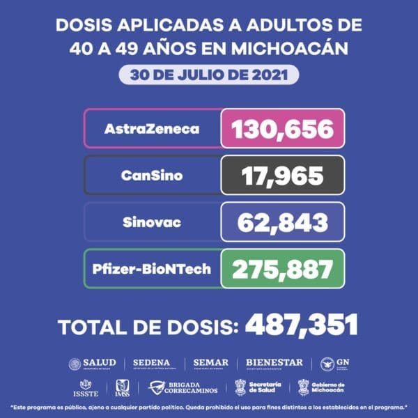 A las personas de 40 a 49 años, hasta el momento se han aplicado 487 mil 351 de los cuatro biológicos y a los de 30 a 39 años, un total de 250 mil 654 dosis.