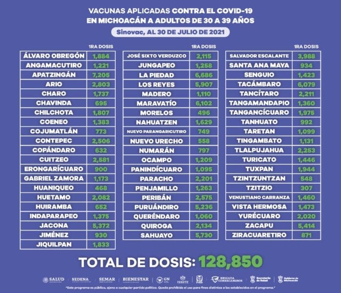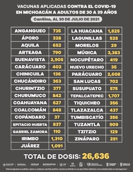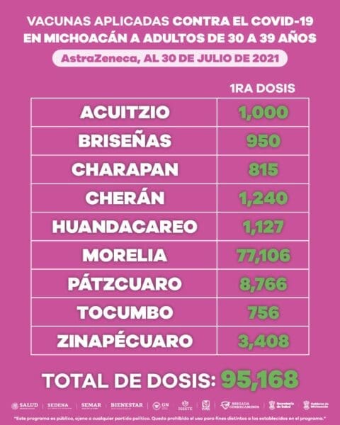 Morelia, Michoacán a 30 de Julio de 2021.- La coordinación interinstitucional para la inmunización de la población contra COVID-19, ha permitido la aplicación de 2 millones 187 mil 14 dosis de vacunas en la entidad.