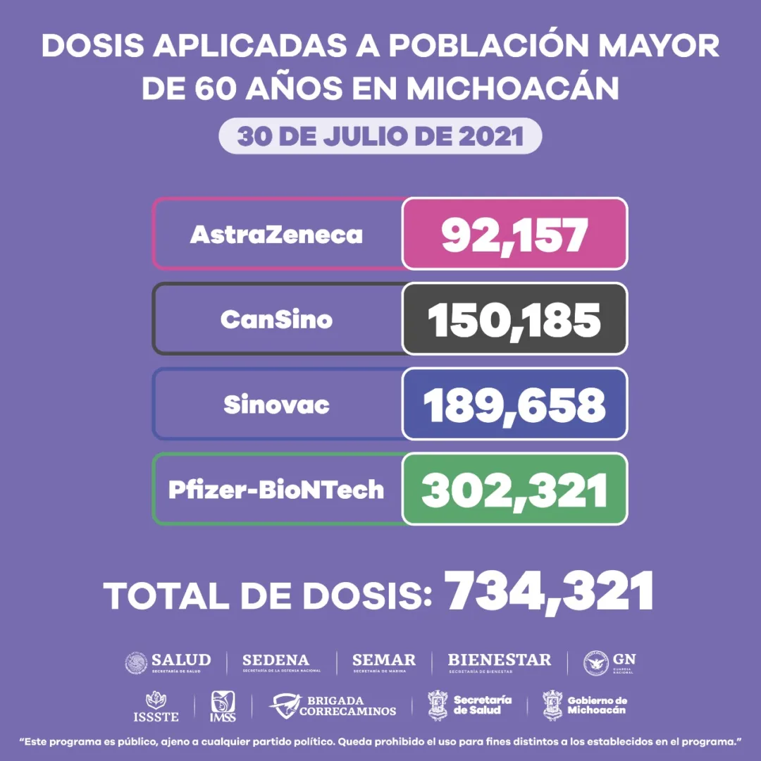 De estas, 20 mil 935 fueron a mujeres embarazadas, 101 mil 615 a docentes, 25 mil 438 a personal de salud; hasta la fecha, adultos mayores de 60 años han recibido un total de 734 mil 321 dosis de las vacunas de AstraZeneca, CanSino, Sinovac y Pfizer.