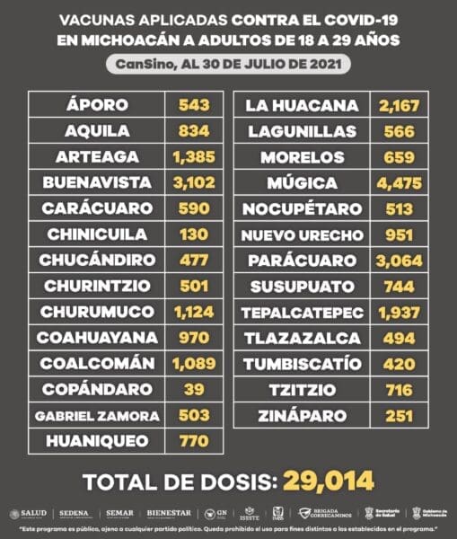 En 27 municipios de la entidad, la población de 18 a 29 años ha recibido 29 mil 14 dosis de Cansino, con lo que su esquema de vacunación está completo, ya que el biológico es de una sola aplicación.