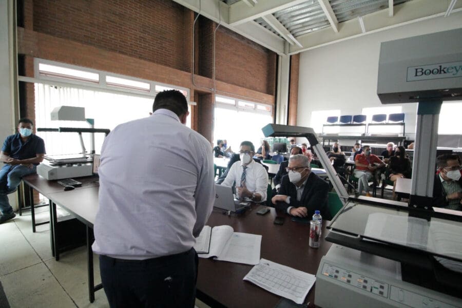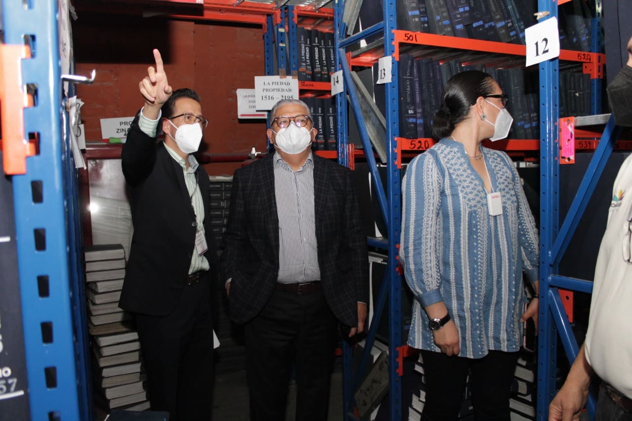 Durante el recorrido realizado en compañía del director general del Instituto Registral y Catastral, Sergio Rodríguez Muñoz, así como del director del Registro Público de la Propiedad, Mauricio Reyes Hernández, el encargado de las finanzas estatales pudo conocer de manera directa el nuevo proceso de escaneo de libros registrales y el proceso de elaboración del Folio Real Electrónico.