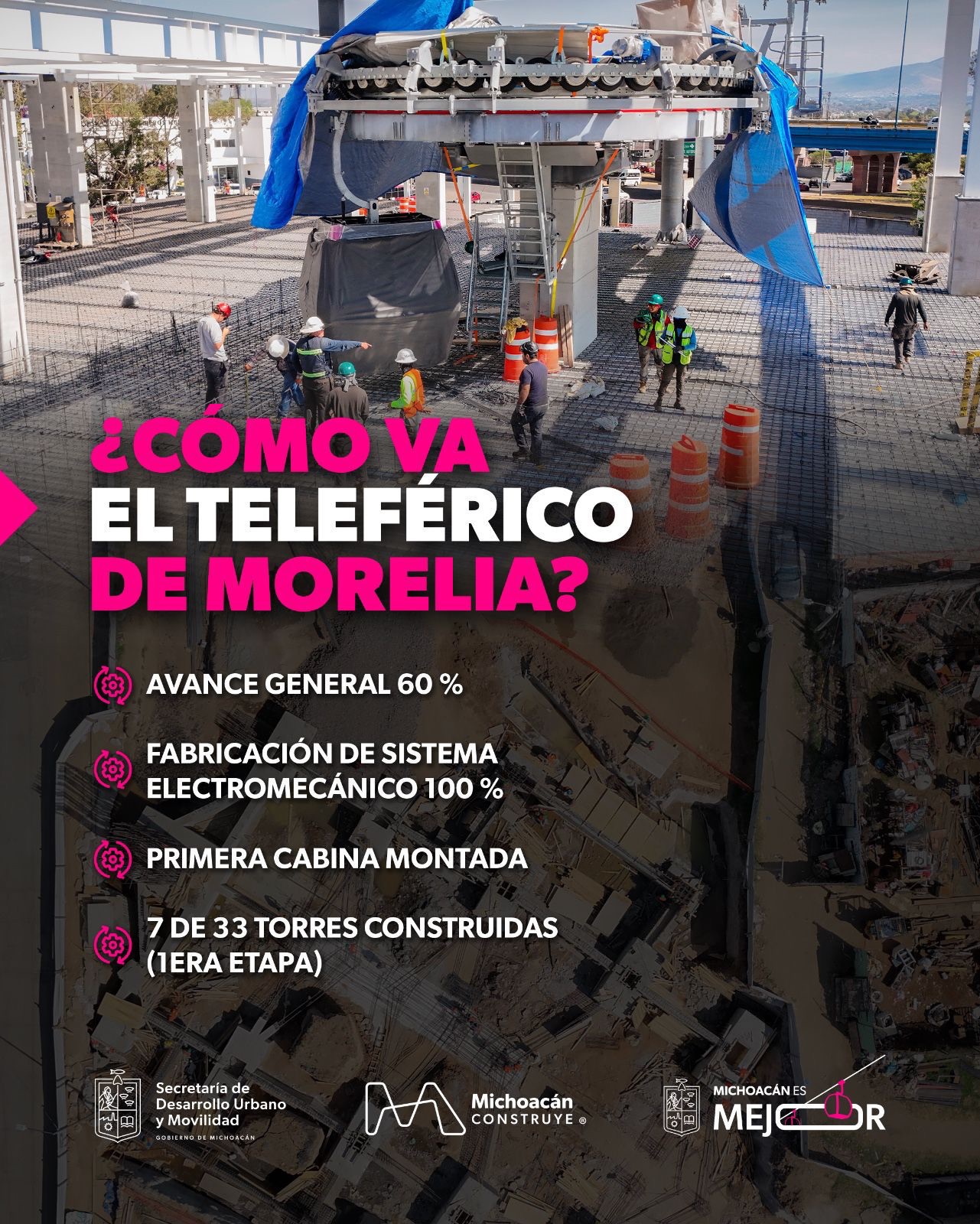 La secretaria de Desarrollo Urbano y Movilidad (Sedum), Gladyz Butanda Macías, informó que la construcción del teleférico de Morelia presenta un avance general del 60 por ciento.