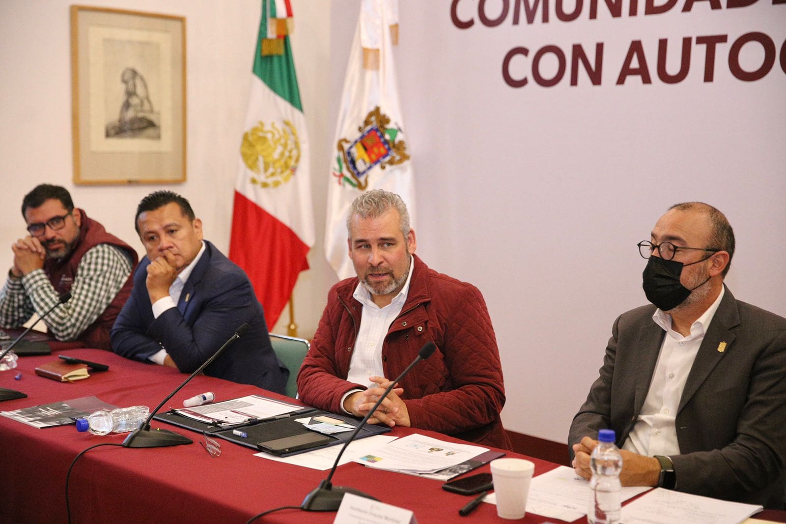 Acompañaron al gobernador, Carlos Torres Piña, secretario de Gobierno, Humberto Urquiza Martínez, subsecretario de Enlace Legislativo y Asuntos Registrales y el representante del Consejo Supremo Indígena de Michoacán, Pavel Guzmán.