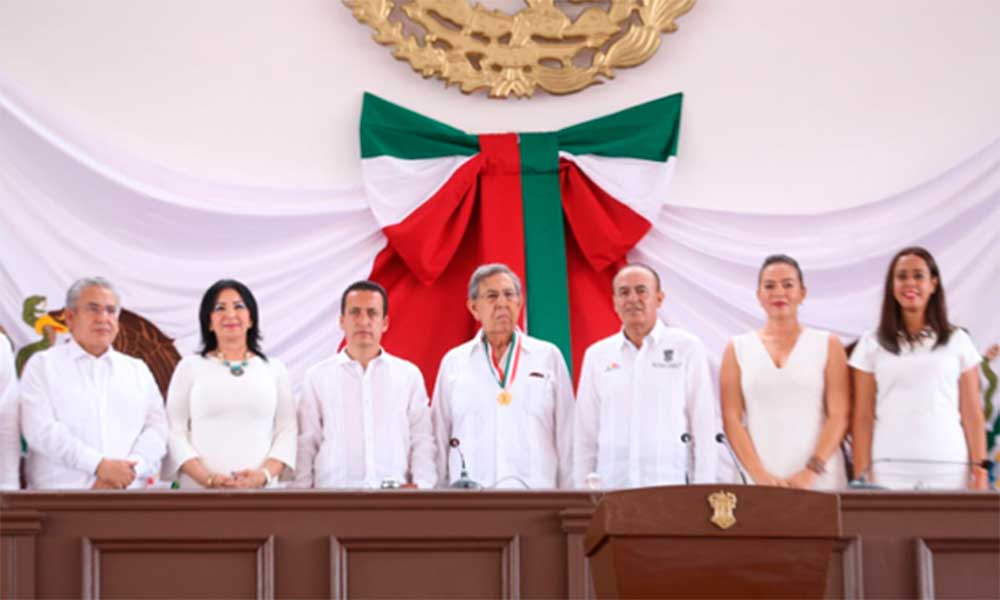 Apatzingán, Michoacán, a 22 de octubre de 2018.- En Sesión Solemne celebrada por el Congreso del Estado esta mañana, en el marco del CCIV Aniversario de la Expedición del Decreto Constitucional para la Libertad de América Mexicana, el secretario de Gobierno, Pascual Sigala Páez otorgó la Condecoración Constitución de Apatzingán al ex Gobernador de Michoacán, Cuauhtémoc Cárdenas Solórzano.