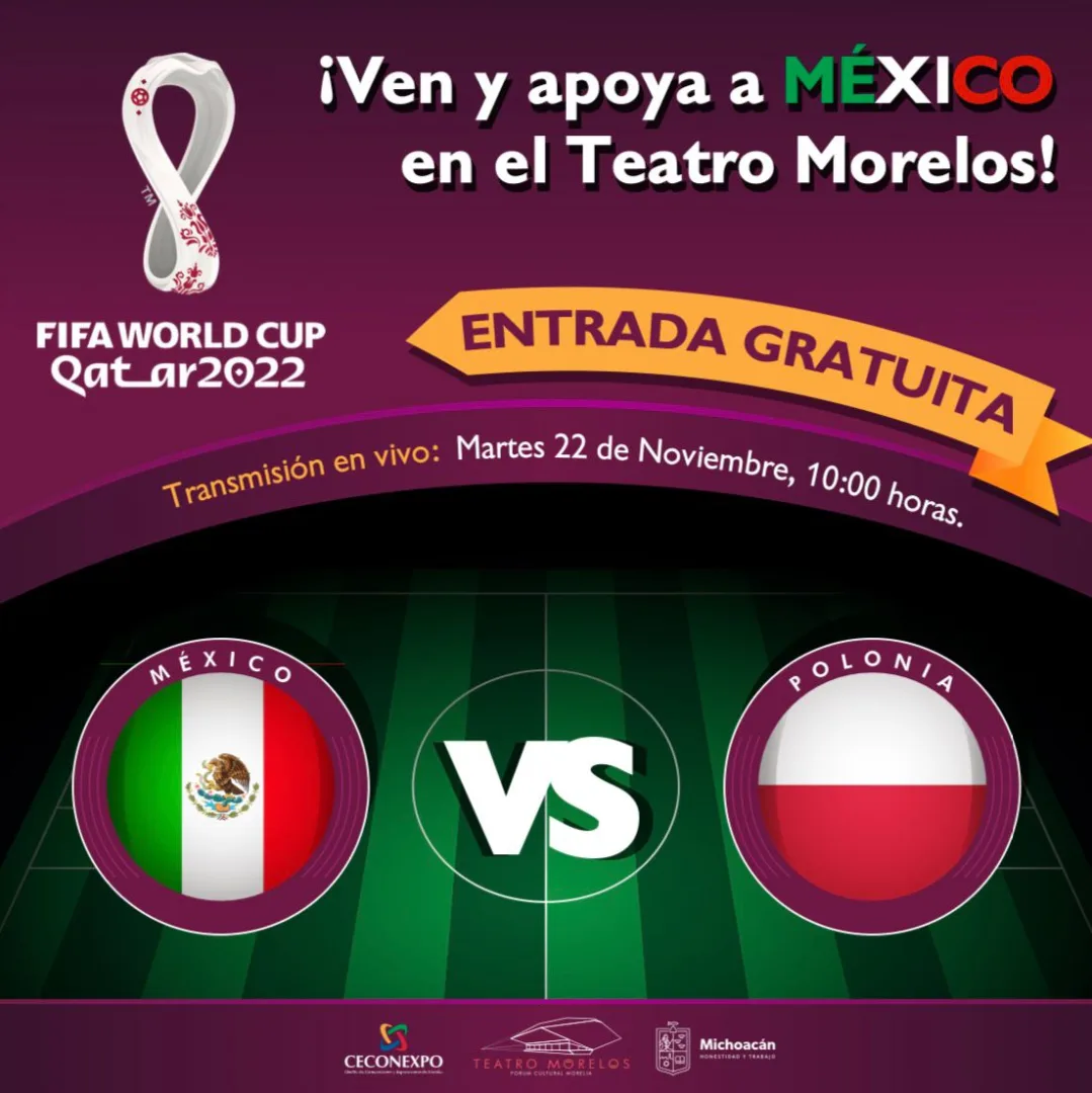 *Morelia, Michoacán, 19 de noviembre de 2022.- El Mundial de Fútbol en Qatar está por comenzar y, por ello, el Gobierno de Michoacán, a través del Centro de Convenciones y Exposiciones de Morelia (Ceconexpo), abrirá las puertas del Teatro Morelos para que las y los michoacanos disfruten los partidos de la Selección Nacional Mexicana en una pantalla gigante, sin costo alguno.