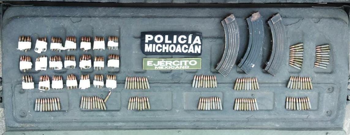 Al efectuar labores operativas en una brecha que conduce a la localidad de El Colomo, el personal de la Policía Michoacán y del Ejército Mexicano localizó sobre la maleza de un predio, un total de 330 cartuchos para calibre 7.62X6 milímetros, así como tres cargadores, por lo que se realizó un perímetro de seguridad en la zona.