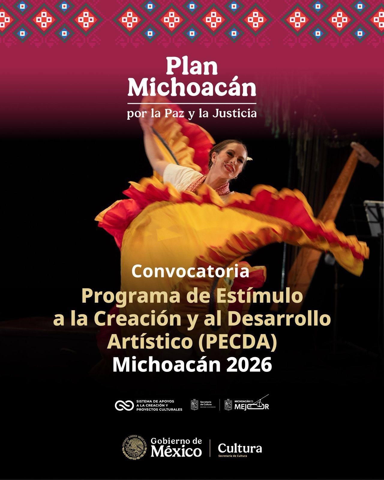 La Secretaría de Cultura de Michoacán (Secum) informó que el próximo viernes 20 de marzo, a las 15:00 horas, concluye el periodo de registro para la convocatoria 2026 del Programa de Estímulo a la Creación y Desarrollo Artístico (PECDA). Este programa, operado en coordinación con la Secretaría de Cultura federal a través del Sistema de Apoyos a la Creación y Proyectos Culturales, dispone de una bolsa económica superior a los 4 millones de pesos distribuida en 74 estímulos.