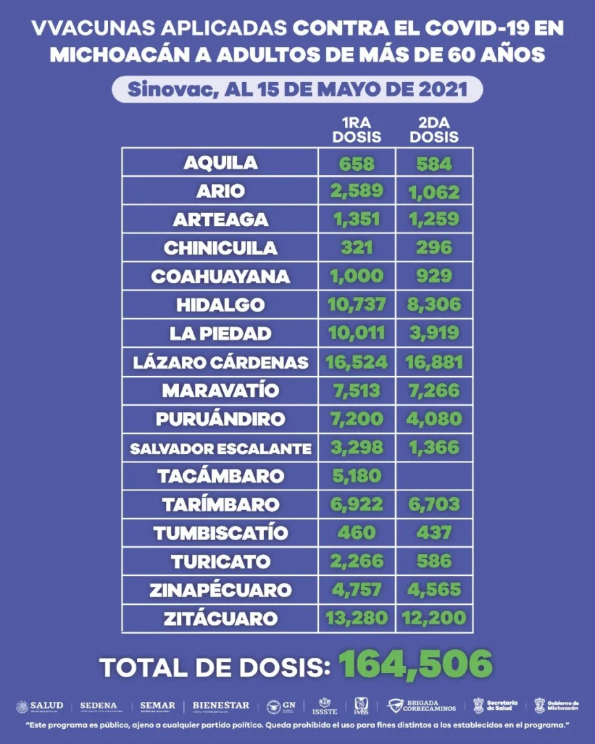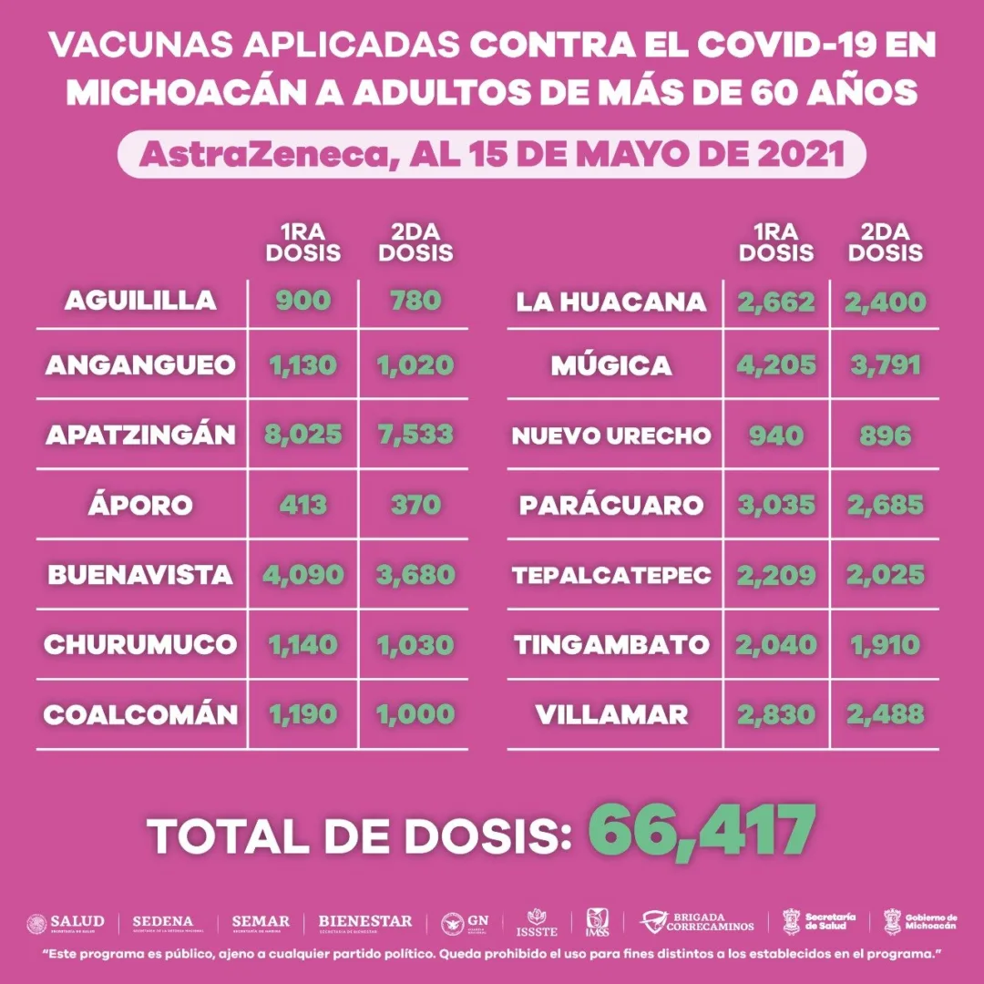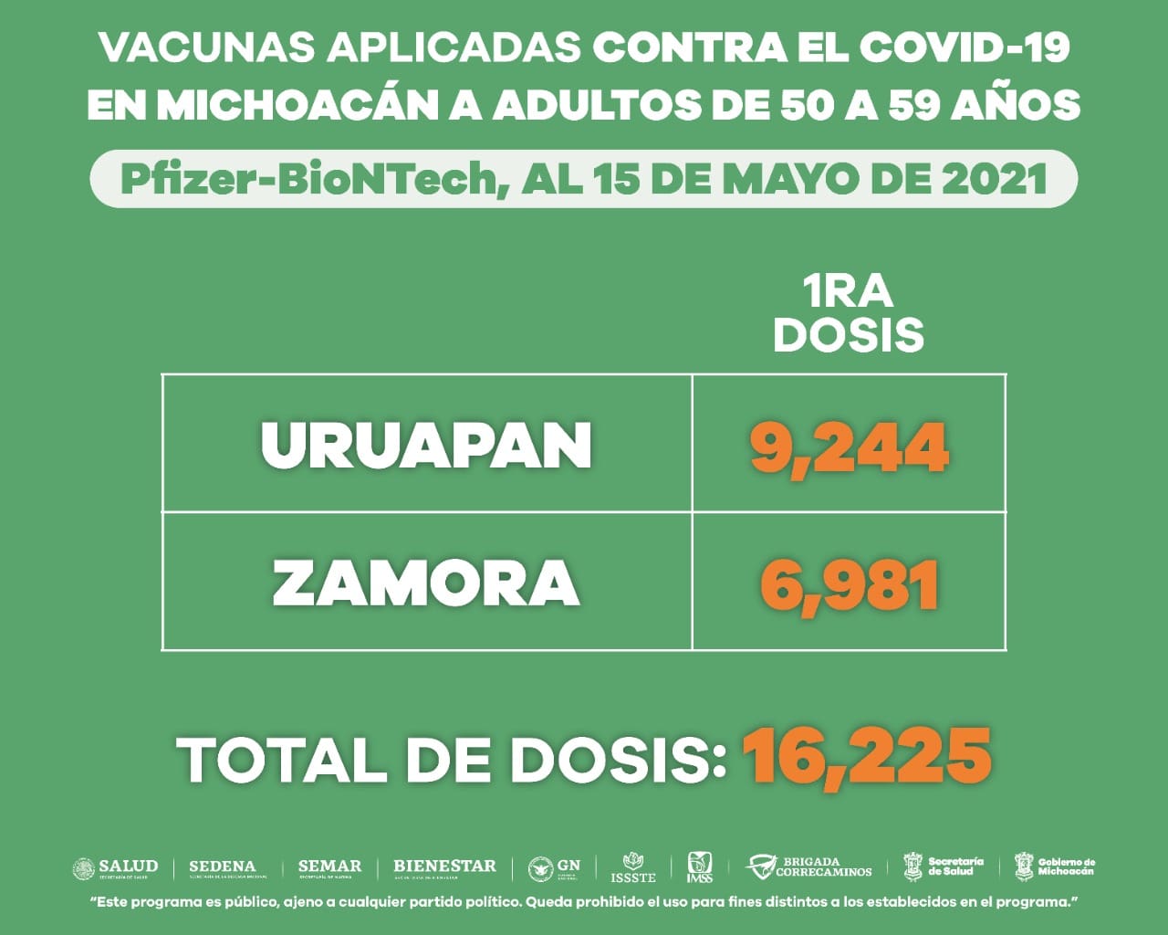 - En Uruapan y Zamora, se han aplicado 16 mil 225 dosis a personas de 50 a 59 años