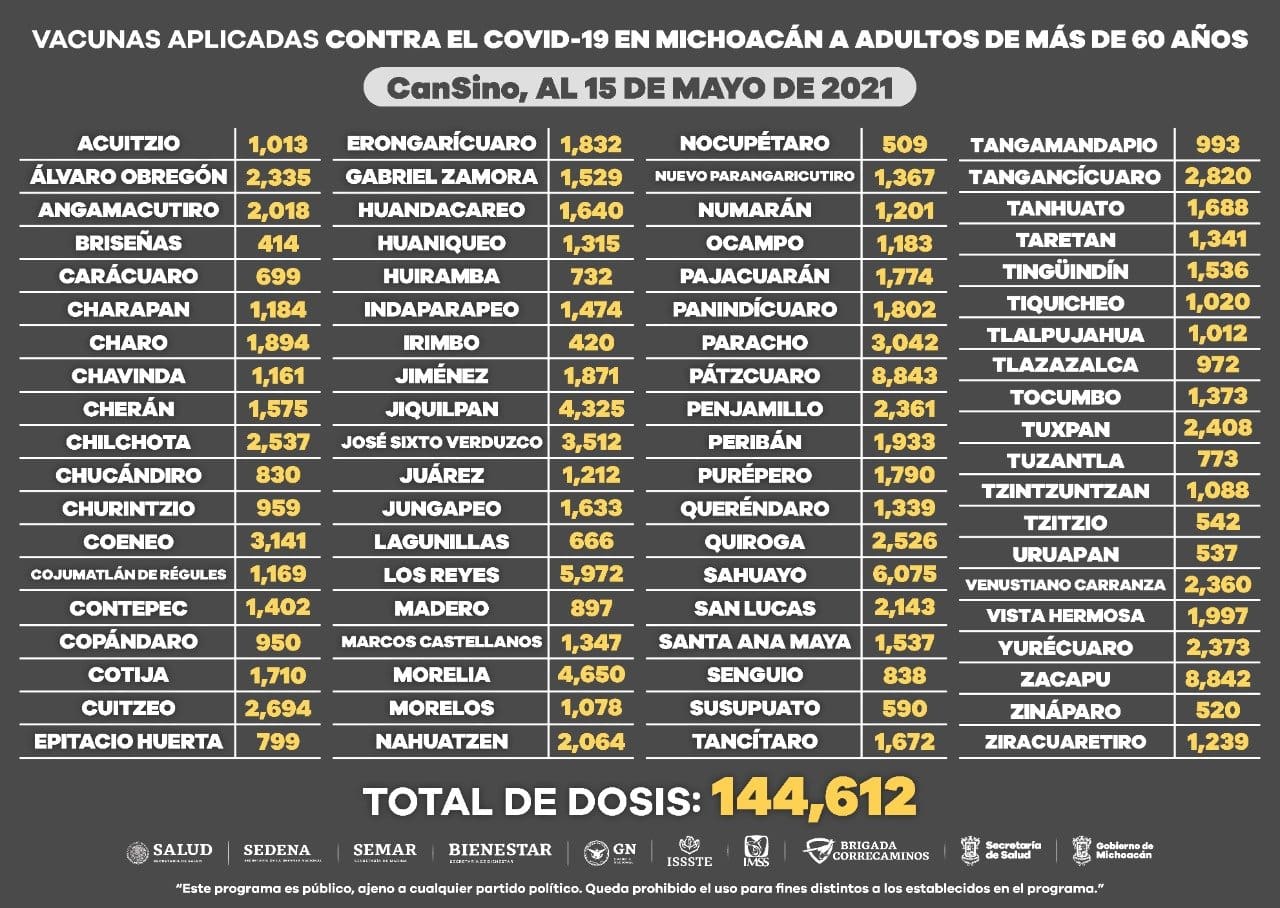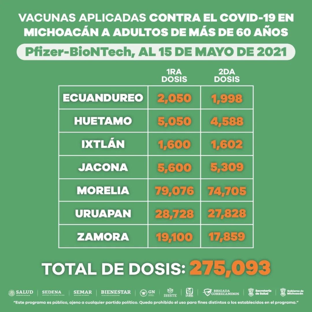 Morelia, Michoacán, a 15 de mayo de 2021.- La Secretaría de Salud de Michoacán (SSM), informa que en la entidad se han aplicado 650 mil 628 dosis de vacunas contra COVID-19 a adultos mayores de 60 años.
