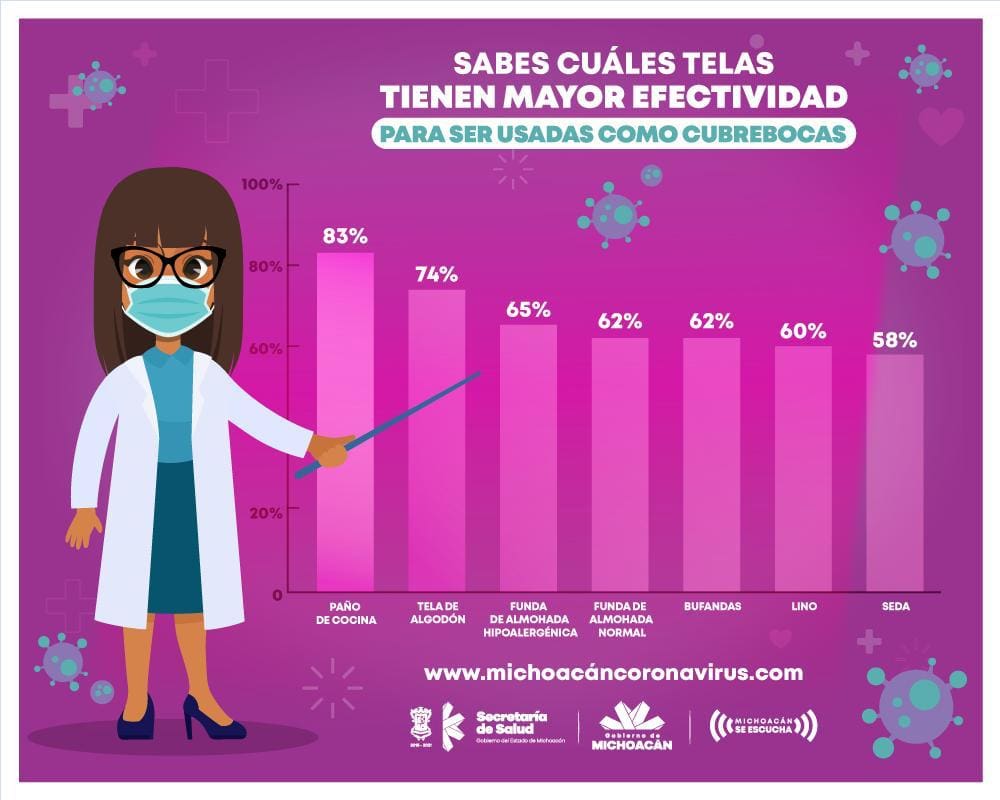 Entre las telas que las personas pueden elegir para hacer su cubrebocas se encuentran el algodón, lino, seda, o un paño de cocina, la funda de una almohada hipoalergénica o una bufanda, que tienen entre un 58 y 83 por ciento de efectividad para impedir que la saliva transmita el virus a otra persona.