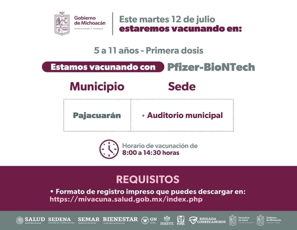 En Pajacuarán la vacunación tendrá lugar en el auditorio municipal, mientras que en Jacona la sede estará en las instalaciones del DIF Municipal, de 8:00 a 14:30 horas.