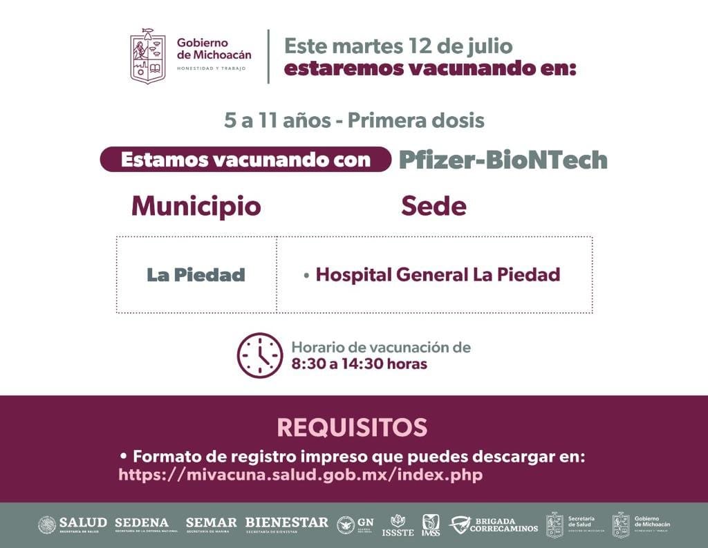 • Este 12 de julio serán inmunizados contra el COVID-19 los menores de La Piedad, Pajacuarán, Jacona, Lázaro Cárdenas y Zitácuaro.