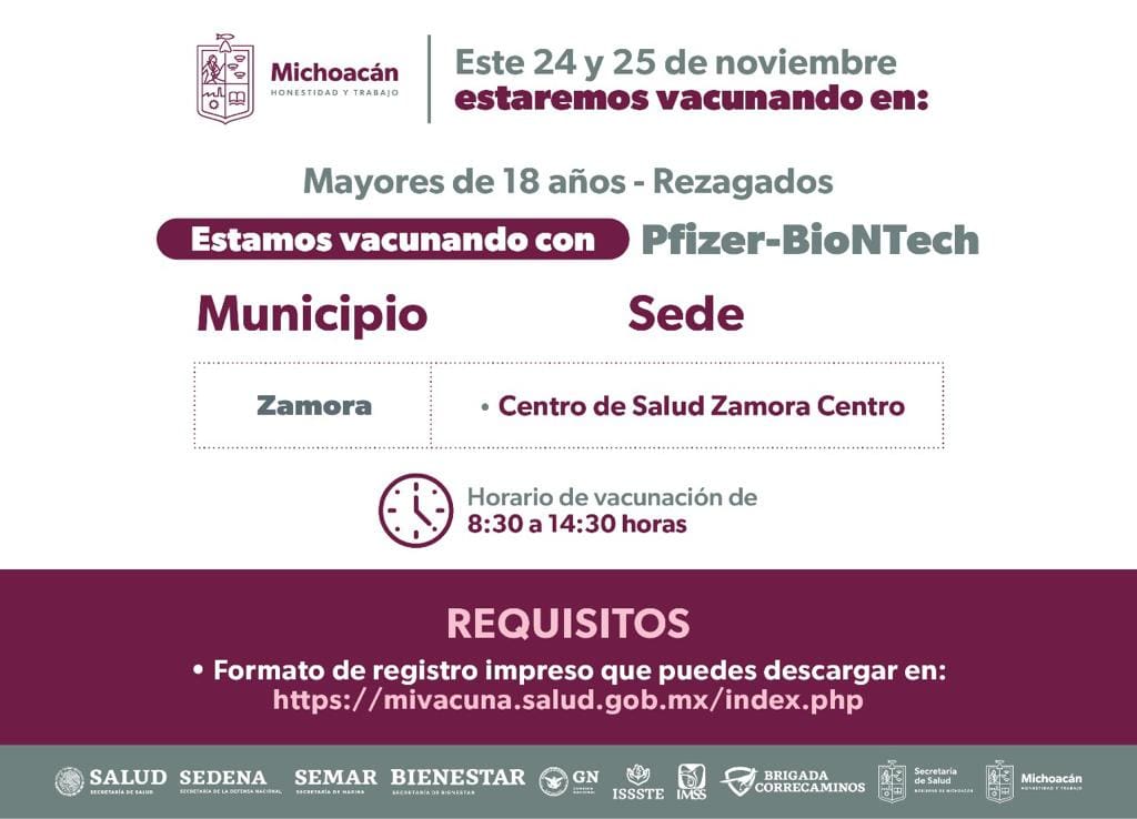 Morelia, Michoacán, 21 de noviembre del 2022.- La vacuna Pfizer para personas mayores de 18 años en rezago estará siendo aplicada en 43 localidades y municipios del estado.