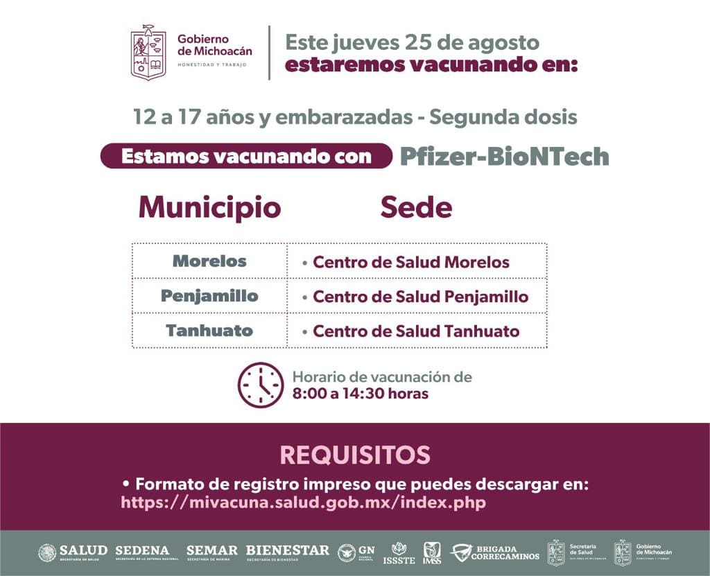 Morelia, Michoacán, 25 de agosto del 2022.- El Gobierno de Michoacán vacunará contra el Covid-19 a las embarazadas y adolescentes de 12 a 17 años, este jueves 25 de agosto.