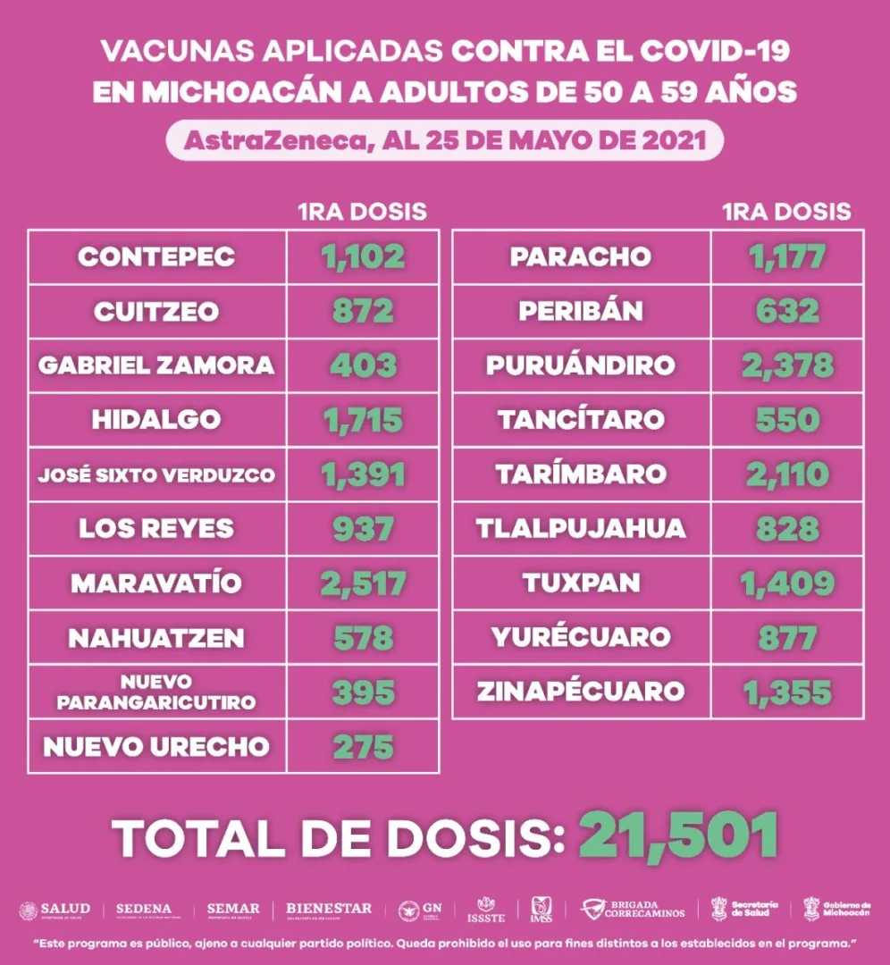 Otras 21 mil 501 dosis de AstraZeneca han sido aplicadas en Contepec, Cuitzeo, Gabriel Zamora, Hidalgo, José Sixto Verduzco, Los Reyes, Maravatío, Nahuatzen, Nuevo Parangaricutiro, Nuevo Urecho, Paracho, Peribán, Puruándiro, Tancítaro, Tarímbaro, Tlalpujahua, Tuxpan, Yurécuaro y Zinapécuaro.