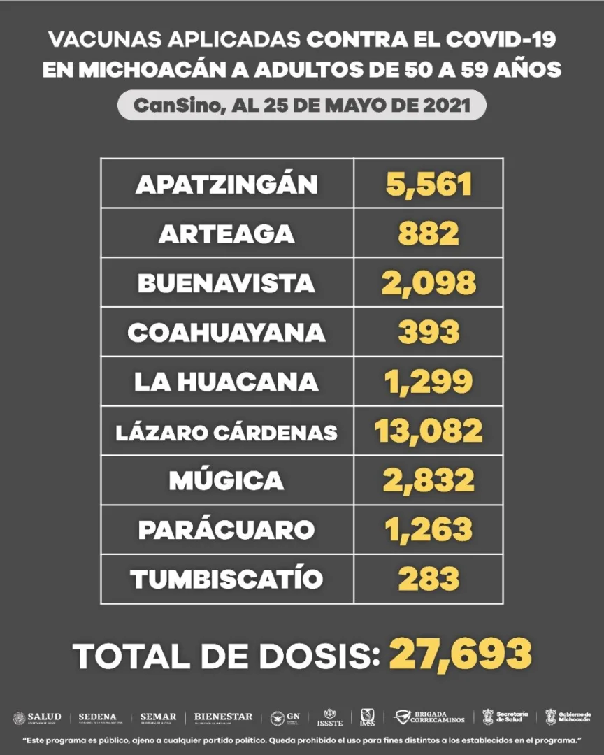Morelia, Michoacán, a 25 de mayo 2021.- Hasta el día de hoy se han aplicado 169 mil 901 dosis de vacuna anti COVID-19, dirigida a población de 50 a 59 años, de las farmacéuticas CanSino, Pfizer y AstraZeneca, en beneficio de 34 municipios.