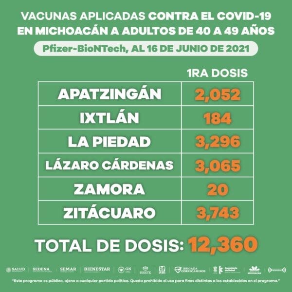 Morelia, Michoacán, a 16 de junio de 2021.- Un total de 69 mil 858 michoacanos de 40 a 49 años, pertenecientes a 27 municipios, han sido inmunizadas contra el COVID-19.