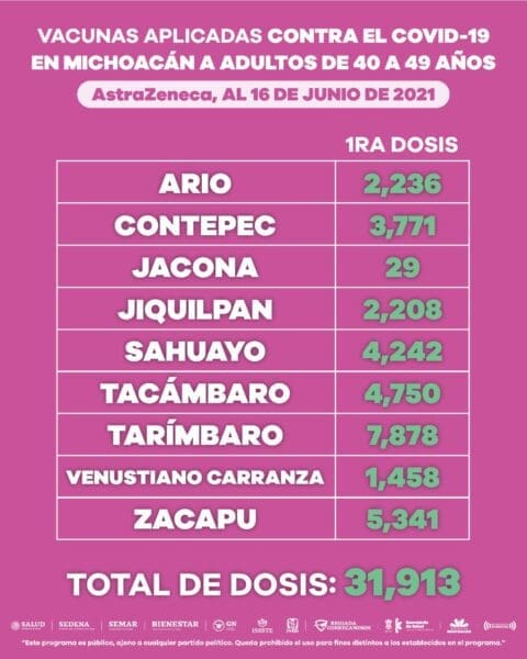Finalmente, la vacuna AstraZeneca fue aplicada a 31 mil 913 pobladores de Ario, Contepec, Jacona, Jiquilpan, Sahuayo, Tacámbaro, Tarímbaro, Venustiano Carranza y Zacapu.