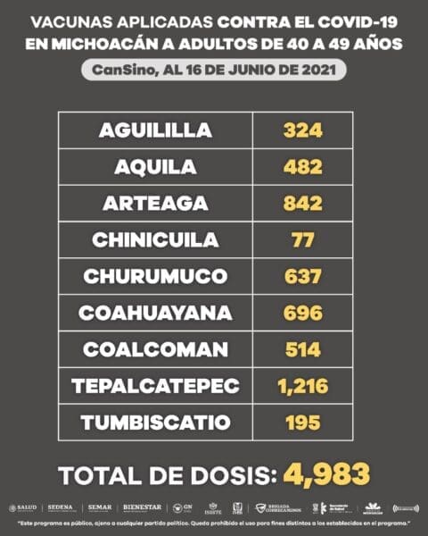 Mientras que en Aguililla, Aquila, Arteaga, Chinicuila, Churumuco, Coahuayana, Coalcomán, Tepalcatepec y Tumbiscatío se inmunizaron 4 mil 983 personas con el biológico CanSino.