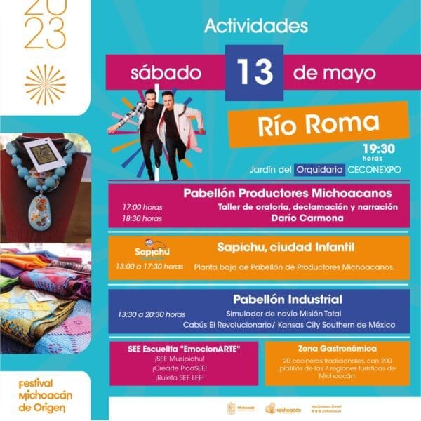 Morelia, Michoacán, 13 de mayo de 2023.- Pasa un sábado sensacional en compañía de toda tu familia en el Festival Michoacán de Origen, que hoy abre sus puertas a partir de las 12:00 horas. Por la noche, disfruta la presentación de Río Roma, en los jardines del Orquidario, a las 19:30 horas.