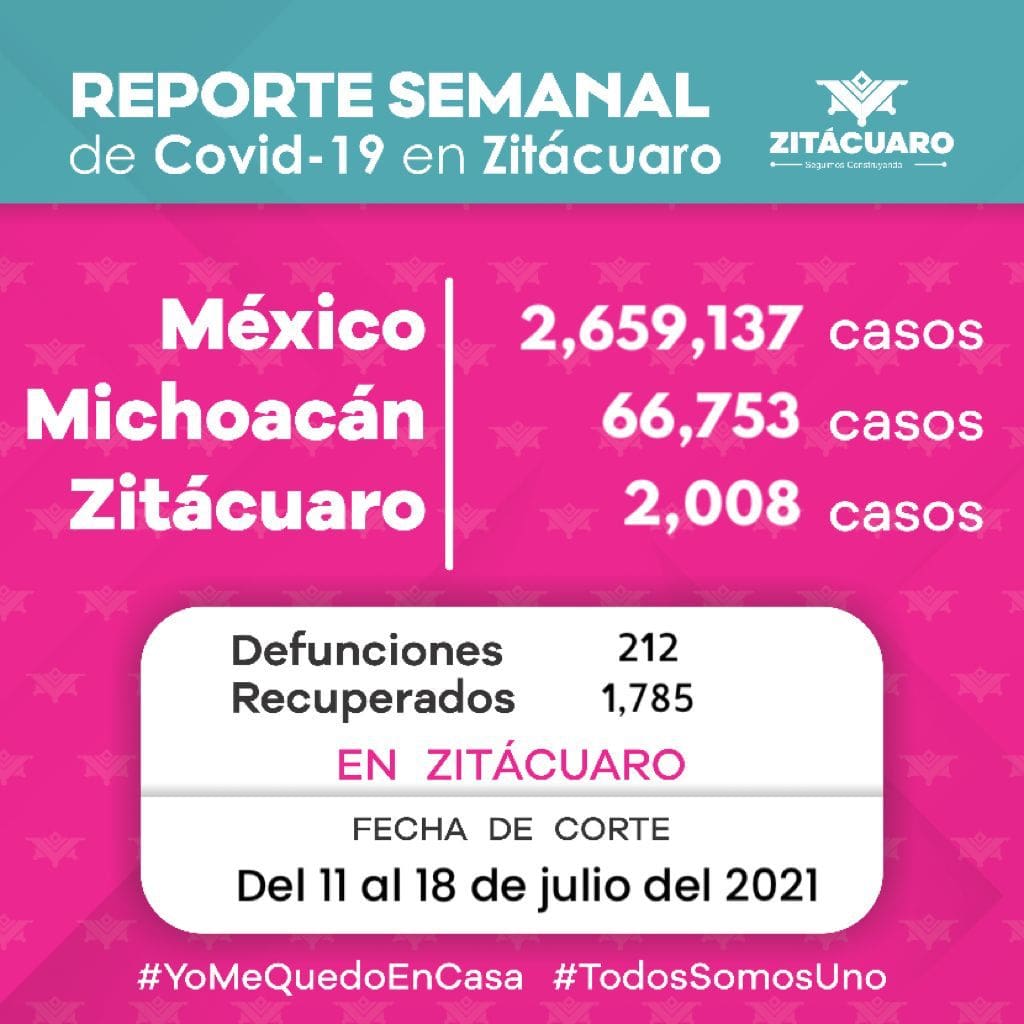 Presentamos la información recabada del 11 al 18 de julio de 2021, la situación del COVID-19 en Zitácuaro es: