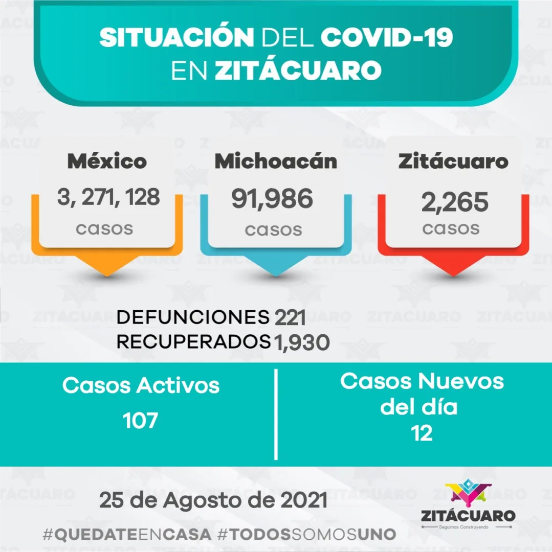 Zitácuaro con alto riesgo de contagio. El día de hoy presenta 12 casos nuevos por covid-19, con corte al 25 de Agosto: