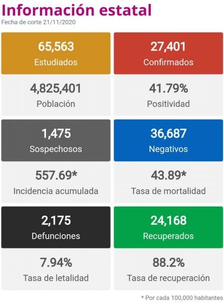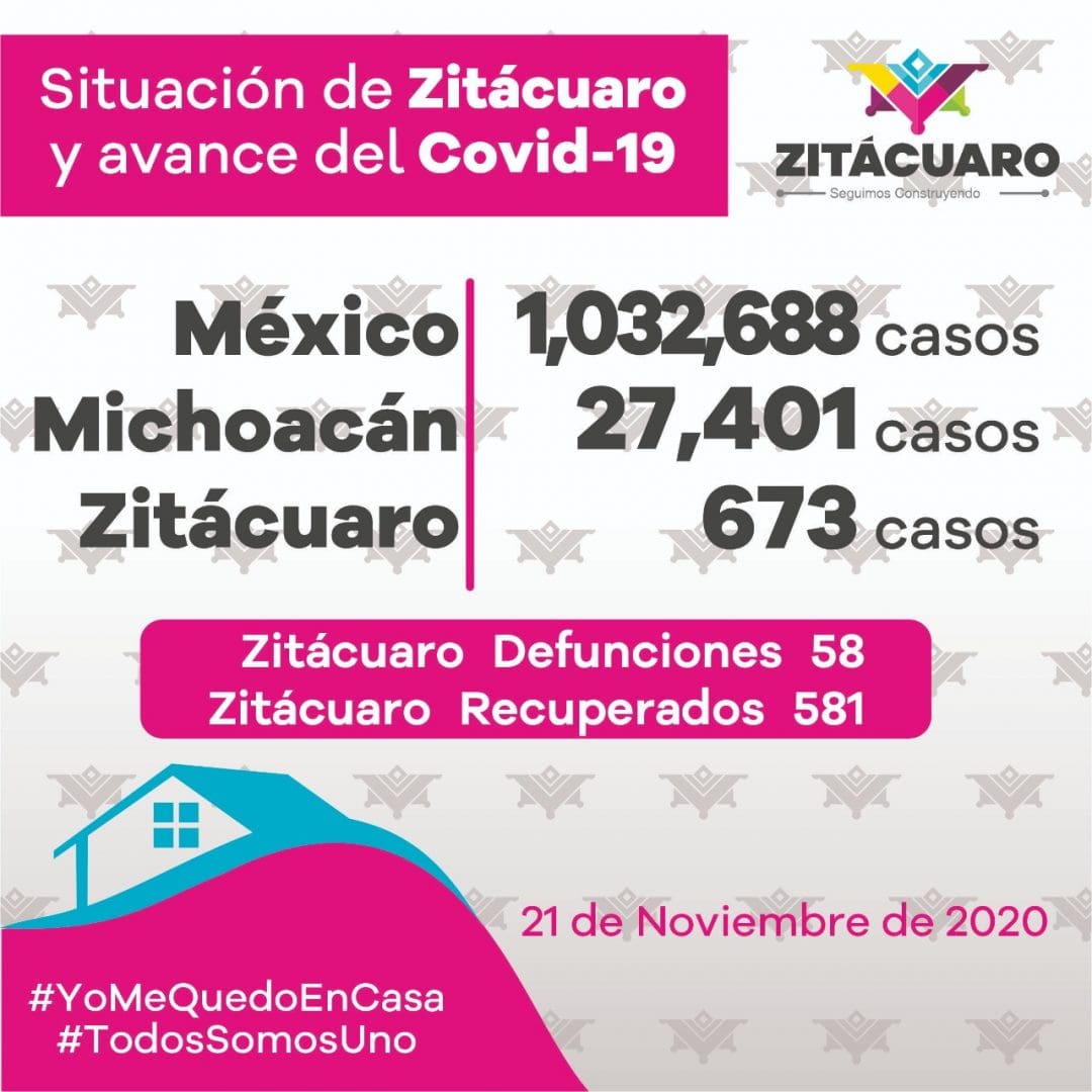 El Gobierno municipal de Zitácuaro que preside el alcalde Hugo Alberto Hernández Suárez, informa la situación de covid-19 en Zitácuaro, de acuerdo al reporte diario emitido por el Comité Estatal de Seguridad en Salud, mismo que se encuentra disponible en https://michoacancoronavirus.com/nuevaconvivencia/ con corte al 21 de noviembre de 2020: