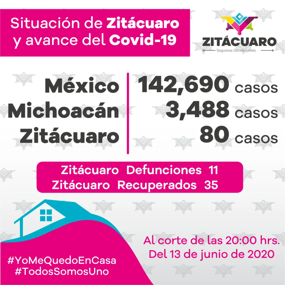 De acuerdo al comunicado diario emitido por el Comité Estatal de Seguridad en Salud y a la información publicada en https://michoacancoronavirus.com/nuevaconvivencia/ en Zitácuaro y el estado, con corte al 13 de junio, de 2020, a las 20:00 hrs. se reportan: