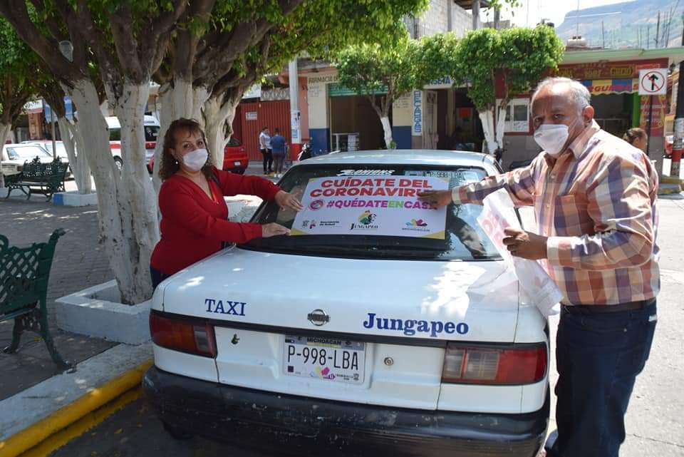 Jungapeo Michoacán.-Con la finalidad de concientizar a todos los jungapenses para que tomen medidas para evitar el contagio del Covid-29,el edil municipal el Arq. José Lugo Rodríguez y su esposa la Dra. Laura Marín Escobar, realizaron una campaña de pega de microperforados a los taxis de servicio público del municipio a como tambien a vehículos particulares.