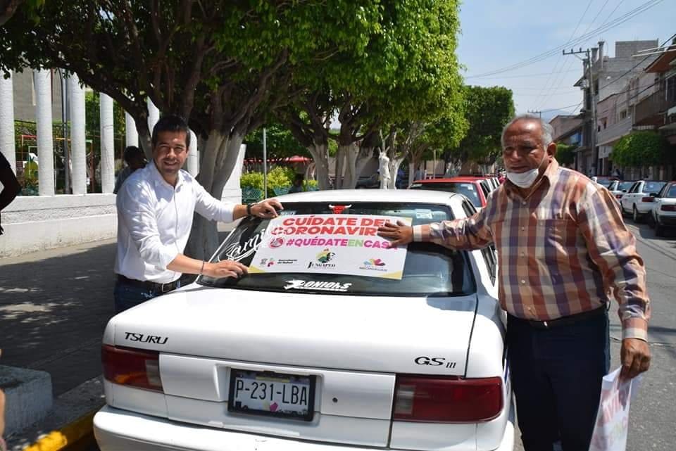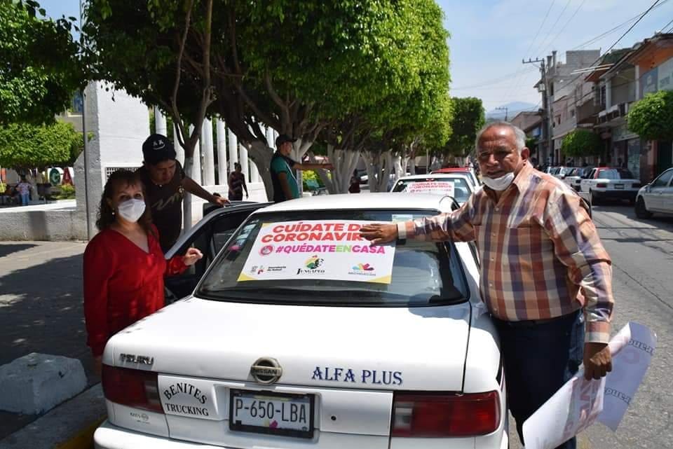 Jungapeo Michoacán.-Con la finalidad de concientizar a todos los jungapenses para que tomen medidas para evitar el contagio del Covid-29,el edil municipal el Arq. José Lugo Rodríguez y su esposa la Dra. Laura Marín Escobar, realizaron una campaña de pega de microperforados a los taxis de servicio público del municipio a como tambien a vehículos particulares.