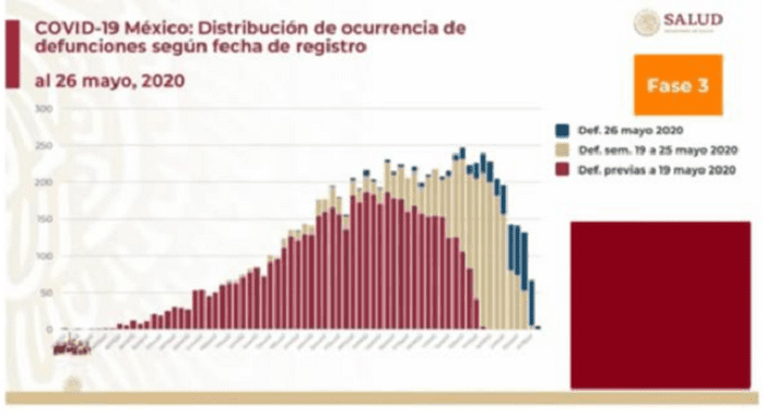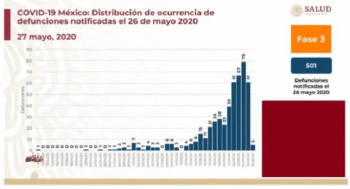 En color rojo se observan todas las defunciones que se registraron hasta el 19 de mayo, en color ocre observamos aquellas que se reportaron entre el 19 y el 25 de mayo y en azul son las que se registraron el 26 de mayo.