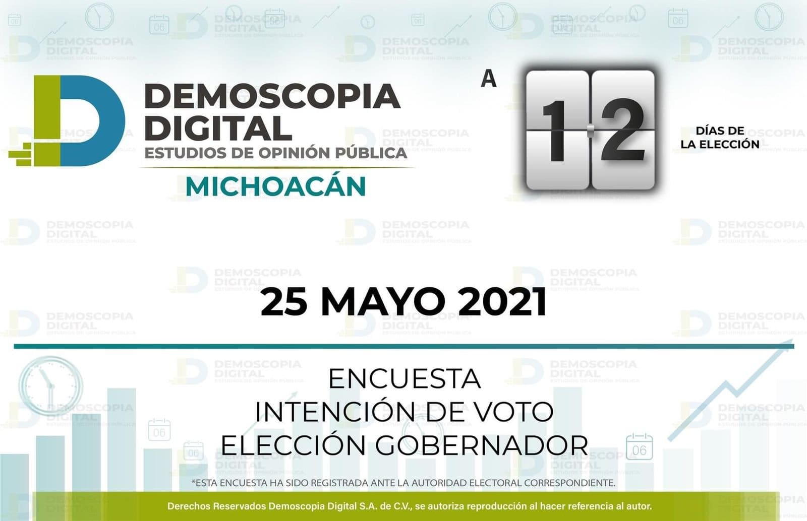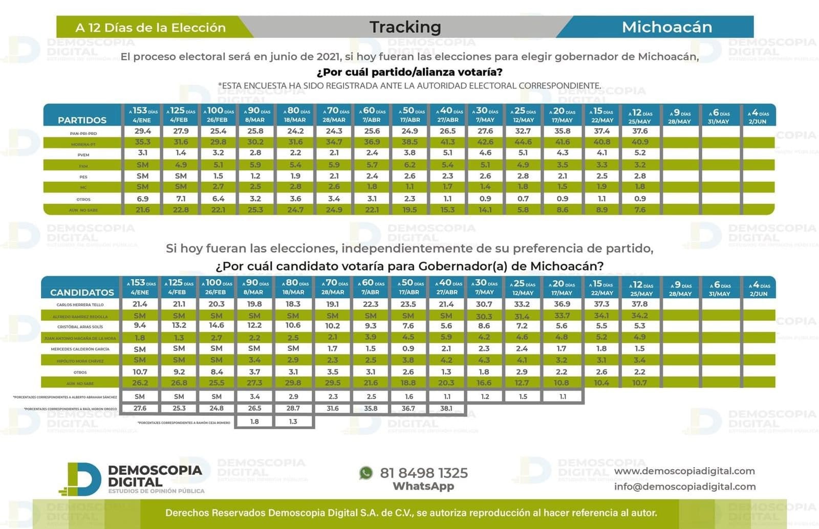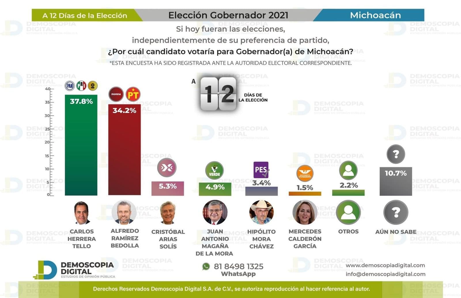 Morelia, Michoacán a 25 de mayo de 2021.- A 12 días de la elección del 6 de junio, el candidato a la gubernatura de Equipo por Michoacán, Carlos Herrera Tello, encabeza las preferencias electorales de la ciudadanía con un 37.8%.