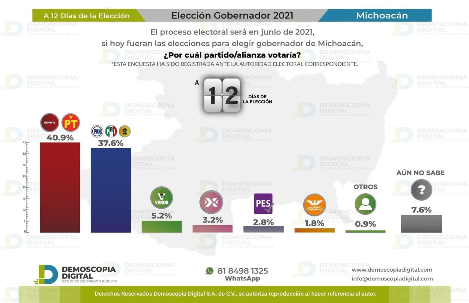 Así lo dio a conocer la casa encuestadora Demoscopia Digital en su más reciente ejercicio estadístico el cual le da una ventaja de 3.6 puntos sobre su contendiente más cercano, el candidato de Morena, Alfredo Ramírez Bedolla al que le da un 34.2 %.