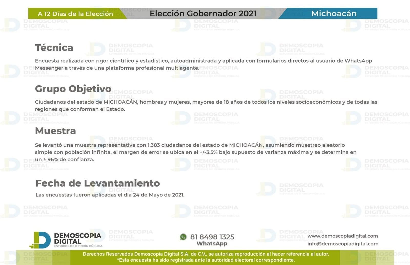 En tanto, la casa encuestadora le da un 5.3 % al candidato de Fuerza por México (FXM), Cristóbal Arias Solís; al candidato del Partido Verde Ecologista de México (PVEM), Juan Antonio Magaña de la Mora, 4.9 %; a Hipólito Mora, del Partido Encuentro Solidario (PES), le otorga un 3.4 %; y a Mercedes Calderón, de Movimiento Ciudadano (MC), 1.5%.