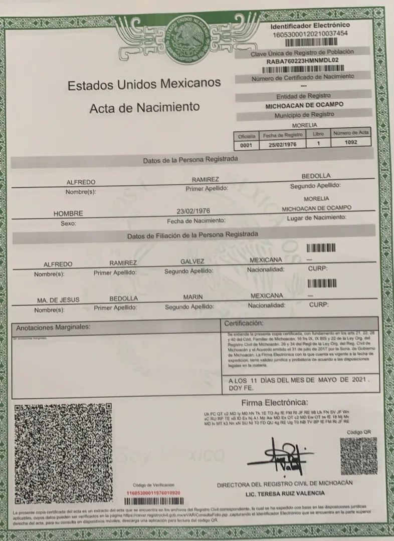 Ciudad de México, a 24 de mayo de 2021.- Actas de nacimiento del Registro Civil de Michoacán demuestran que el candidato de Morena, Alfredo Ramírez Bedolla, es primo hermano de Adalberto Fructuoso Rodríguez Bedolla, detenido a finales de marzo pasado por tráfico de metanfetaminas de México a Estado Unidos, así se dio a conocer por el portal de noticias quadratin.com.mx.
