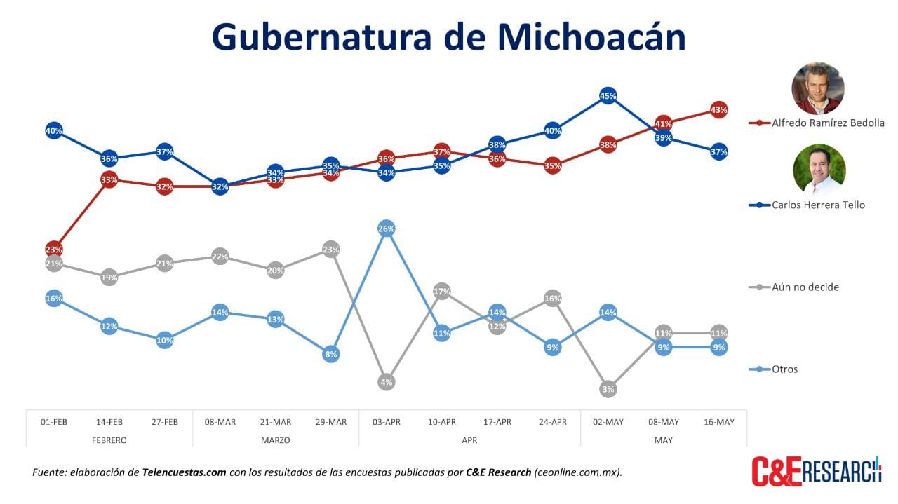 Alfredo Ramírez superó la preferencia electoral en Michoacán el pasado 17 de mayo según la encuesta de C&E Research de la misma fecha .