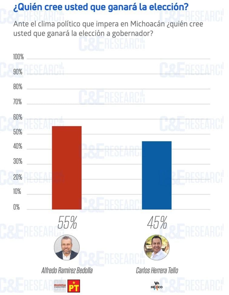 Ante la pregunta de ¿quién cree usted que ganará la elección?, con Ramírez Bedolla y Carlos Herrera como únicas opciones, nuevamente se posicionó arriba Alfredo Ramírez con el 55 por ciento de votos; mientras que Carlos Herrera recibió el 45 por ciento.