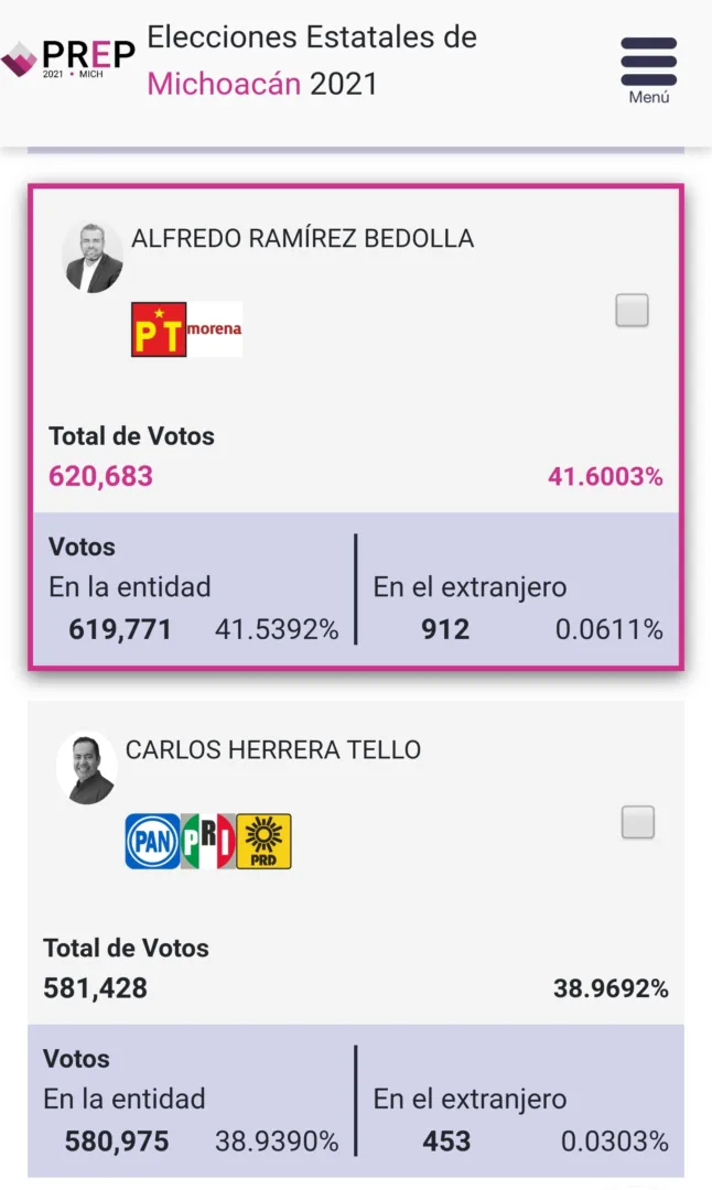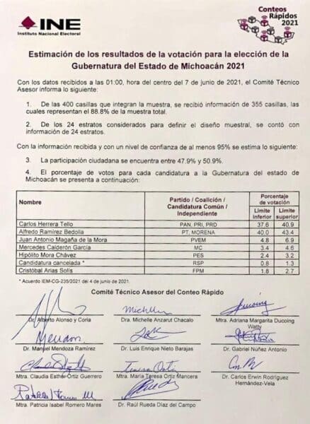 Gubernatura del Estado de Michoacán 2021. Con los datos recibidos a las 01:00, hora del centro del 7 de junio de 2021, el Comité Técnico Asesor informa lo siguiente: