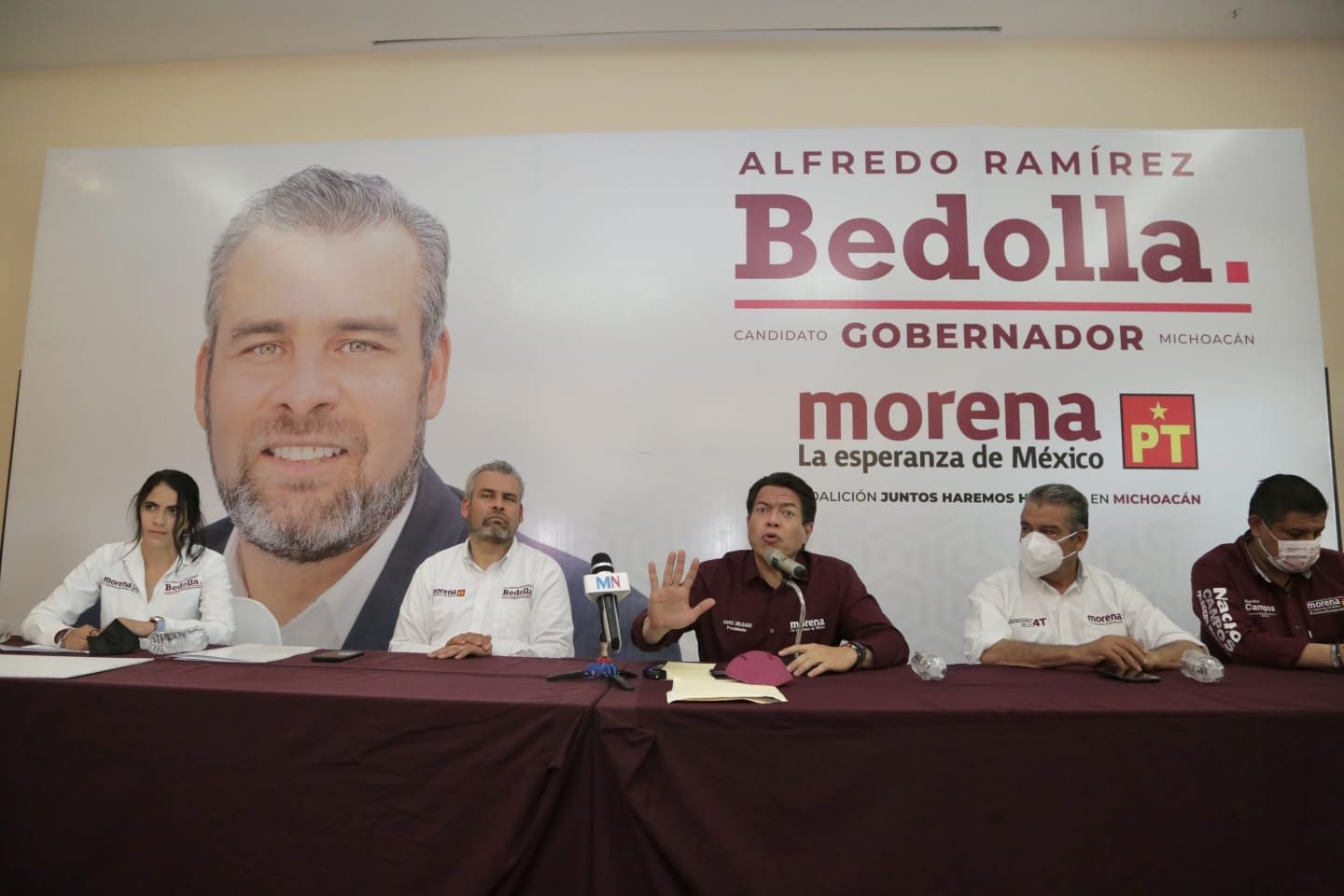 Mario Delgado y Alfredo Ramírez, acompañados también por el dirigente estatal de Morena, Raúl Morón Orozco, y el candidato a presidente municipal de Uruapan, Ignacio Campos, hicieron un llamado a quienes han sido amenazados por el gobernador a denunciar actos intimidatorios, “porque es inadmisible vivir en un estado de amenaza”.