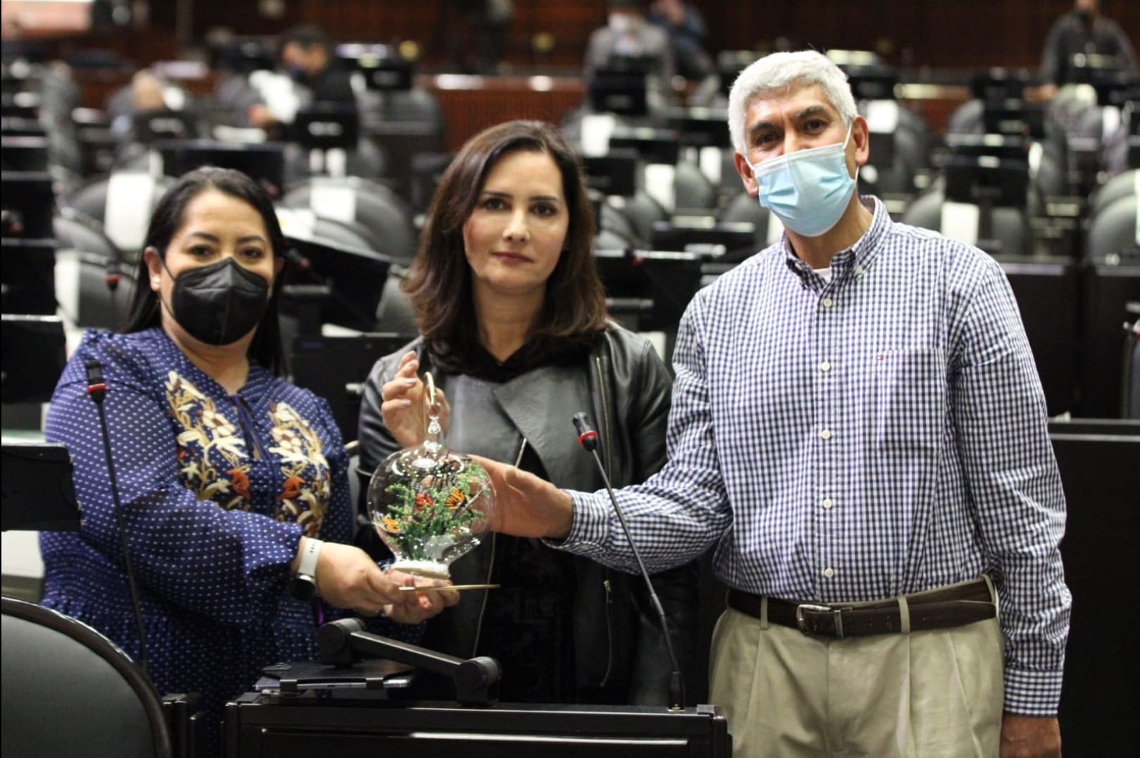Palacio de San Lázaro, 30 de noviembre de 2021.- En el marco de las vísperas de las fiestas decembrinas, la diputada federal michoacana exhorta al gobierno federal a defender la producción de esferas navideñas de los municipios de Tlalpujahua y Chignahuapan, correspondientes a Michoacán y Puebla, motivo por el cual se hizo acompañar de la diputada federal Berenice Juárez Navarrete del Partido Acción Nacional y su amigo el artesano y productor José Miguel Mercado.