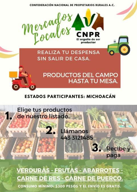 Morelia, Mich.- La Confederación Nacional de Productores Rurales (CNPR) que preside el diputado Eduardo Orihuela Estefan, arrancó el programa “Mercados Locales”, mismo que tiene el objetivo de apoyar precisamente a los productores a comercializar sus productos, llevándolos a los domicilios de las personas y así contribuir con el programa #QuedateEnCasa.