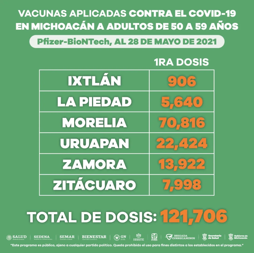 Morelia, Michoacán, a 28 de mayo de 2021.- De acuerdo con el reporte epidemiológico emitido por la Secretaría de Salud de Michoacán (SSM), el 38.22 por ciento de los casos confirmados de COVID-19 en la entidad corresponde a personas de entre 50 y 59 años de edad.