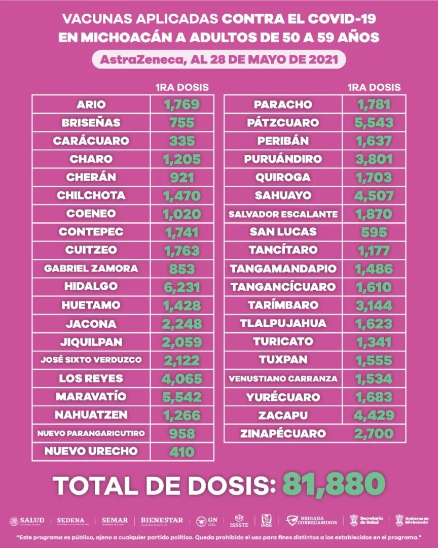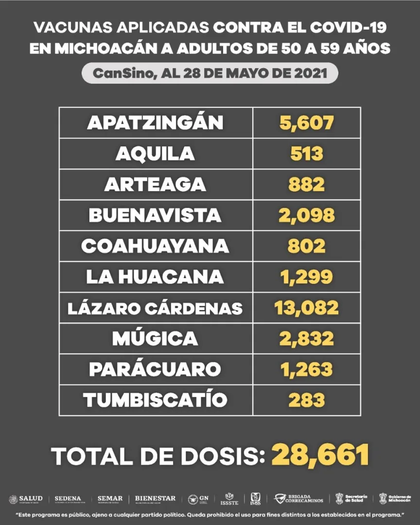 De las dosis aplicadas, 81 mil 880 fueron de AstraZeneca, 121 mil 706 de Pfizer, 28 mil 661 de CanSino y 3 mil 810 de Sinovac.