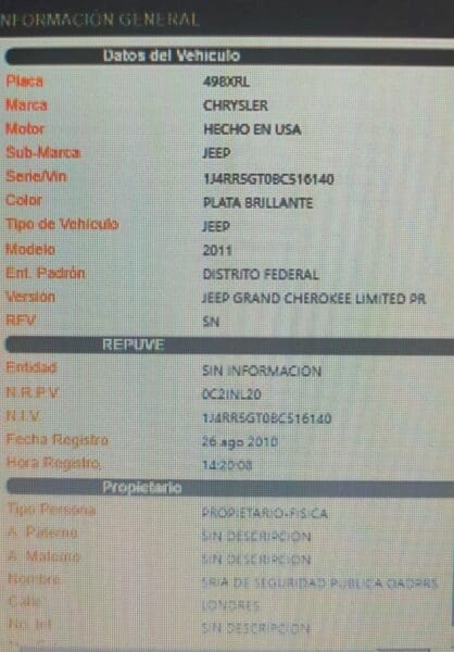 Uno de los vehículos detectados por los reporteros fue una camioneta Jeep Grand Cherokee, con placas 498 XRL de la CDMX, modelo 2011 que en el padrón vehicular federal aparece adjudicada a la Secretaría de Seguridad Pública.