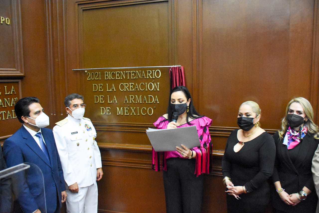 Morelia, Michoacán, 28 de septiembre de 2021. Con el propósito de reconocer la labor en pro de la paz, la seguridad y el bienestar de los mexicanos, el Congreso de Michoacán develó la Leyenda Conmemorativa “2021 Bicentenario de la Creación de la Armada de México”.