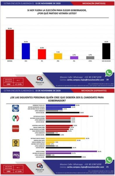 Segun la casa encuestadora Massive Caller, se preguntó a los ciudadanos que si hoy fuera la elección para elegir a gobernador ¿por que partido votaría?, y el resultado arrojó que el 45.1 por ciento se inclina más por los posibles aspirantes de Morena (Movimiento de Regeneración Nacional), el PAN en segundo sitio con 19.2 por ciento, el PRI con 12 por ciento y con 7.1 el PRD.