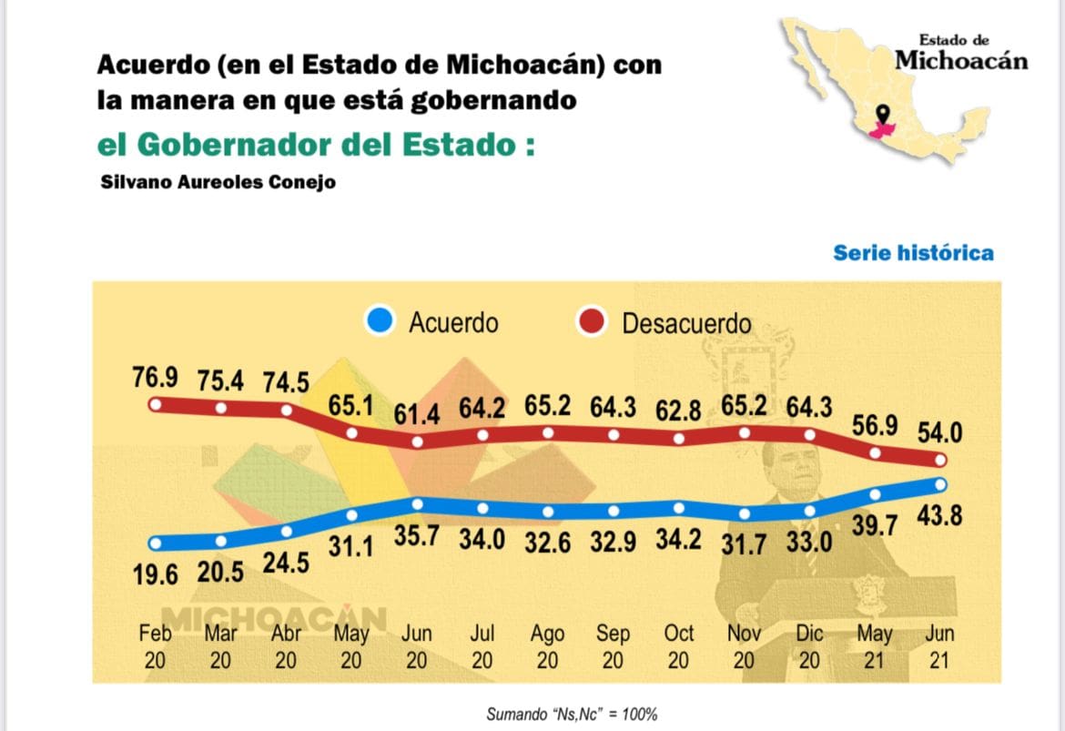 Morelia, Michoacán, a 4 de julio de 2021.- La encuestadora Mitofsky revela que durante los últimos doce meses la aprobación del gobernador Silvano Aureoles Conejo creció en más del 8% entre las y los michoacanos.