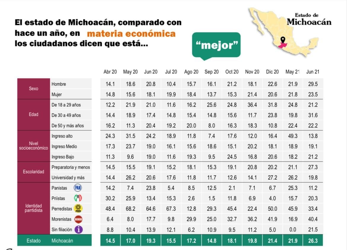 Dicho estudio también revela que, el 26.3% de los michoacanos opina que el estado, comparado con hace un año en materia económica está mejor, esto es un crecimiento del 10.8%.